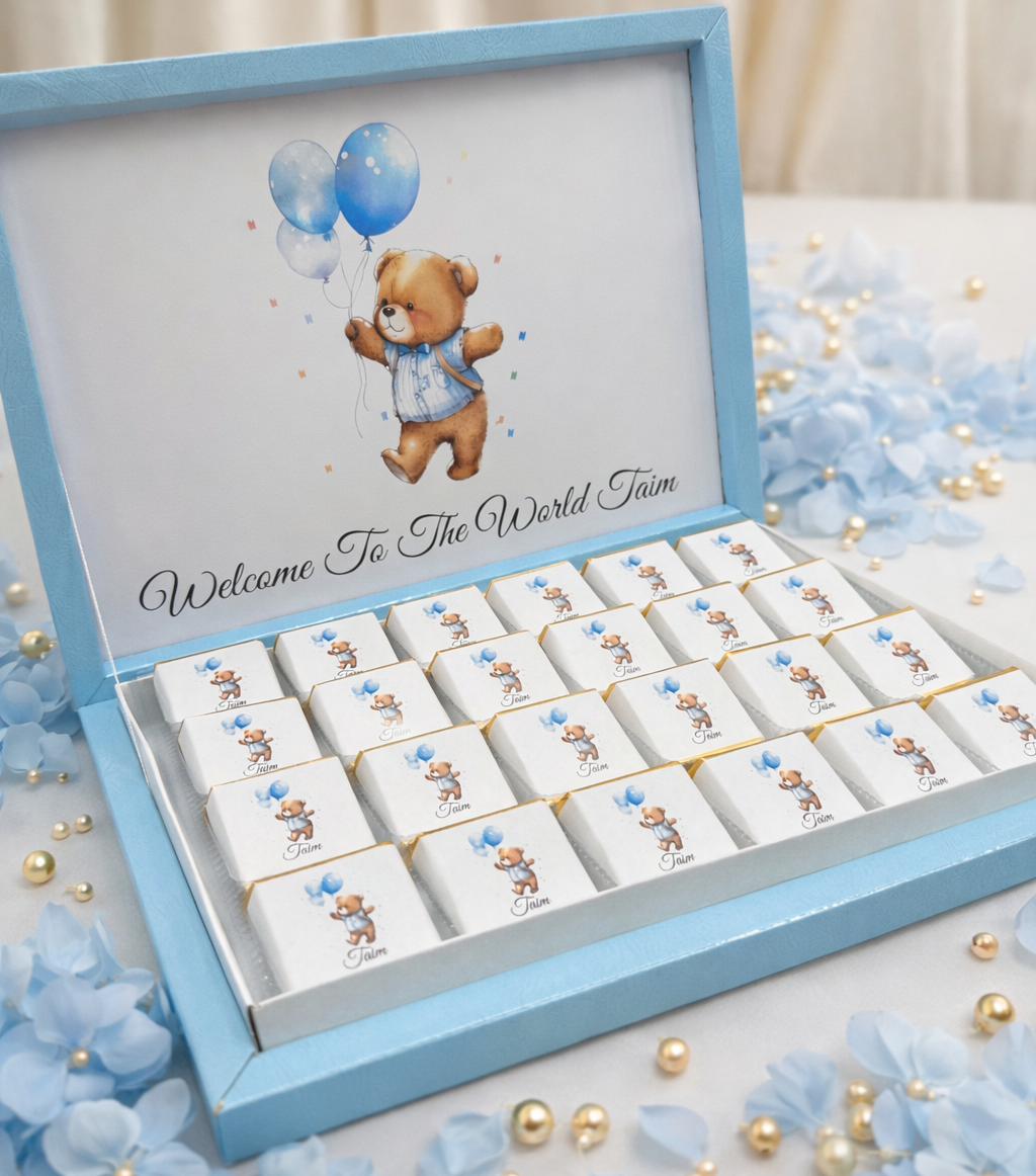 علبة شوكولاتة مخصصة لحفلات استقبال المواليد.