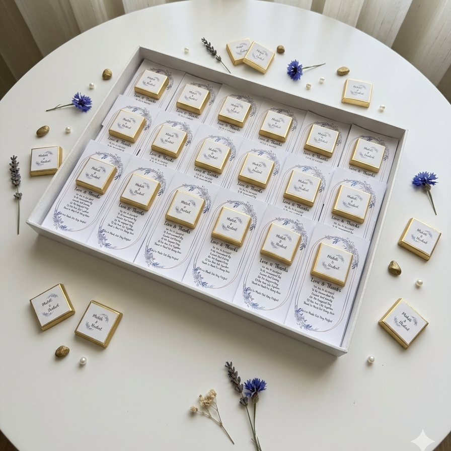 · الوصف: تتكون كل هدية من قطعة شوكولاتة صغيرة مغلفة بورق ذهبي، موضوعة على بطاقة بيضاء مزخرفة باللون الأزرق.